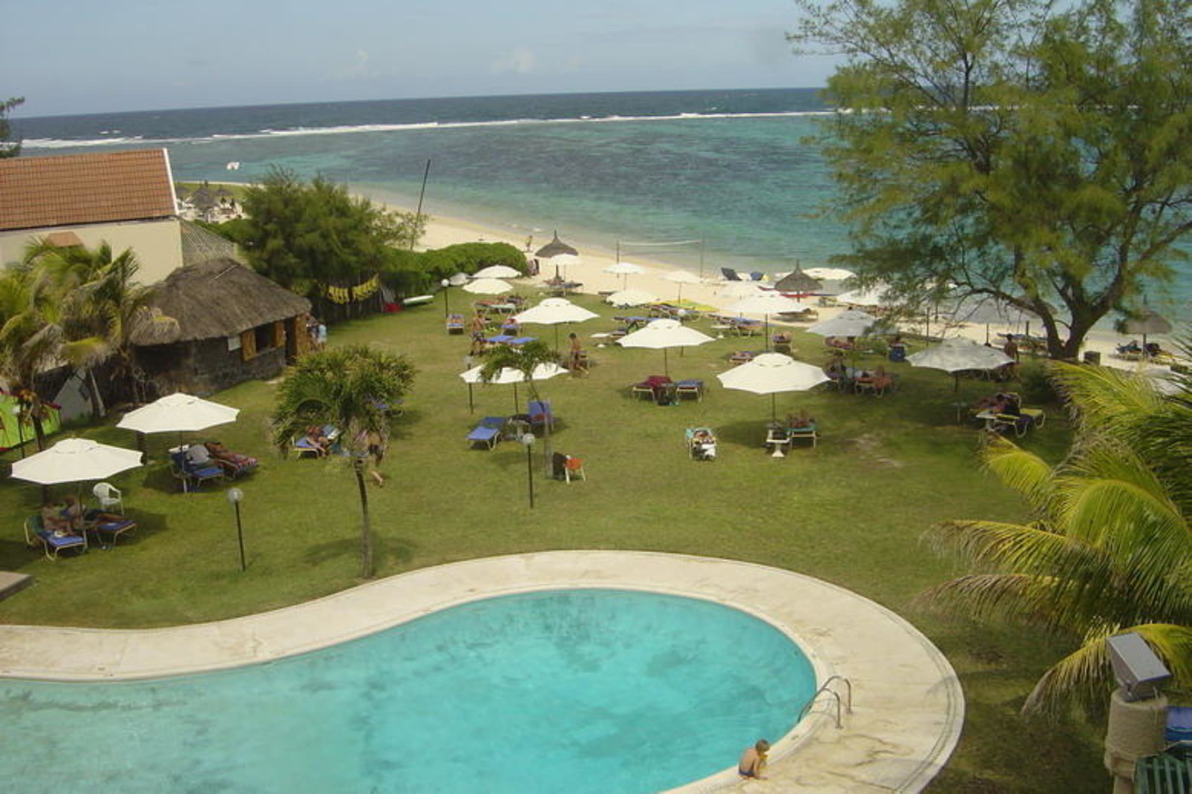 Blick vom Hotel auf die Liegewiese mit Strand