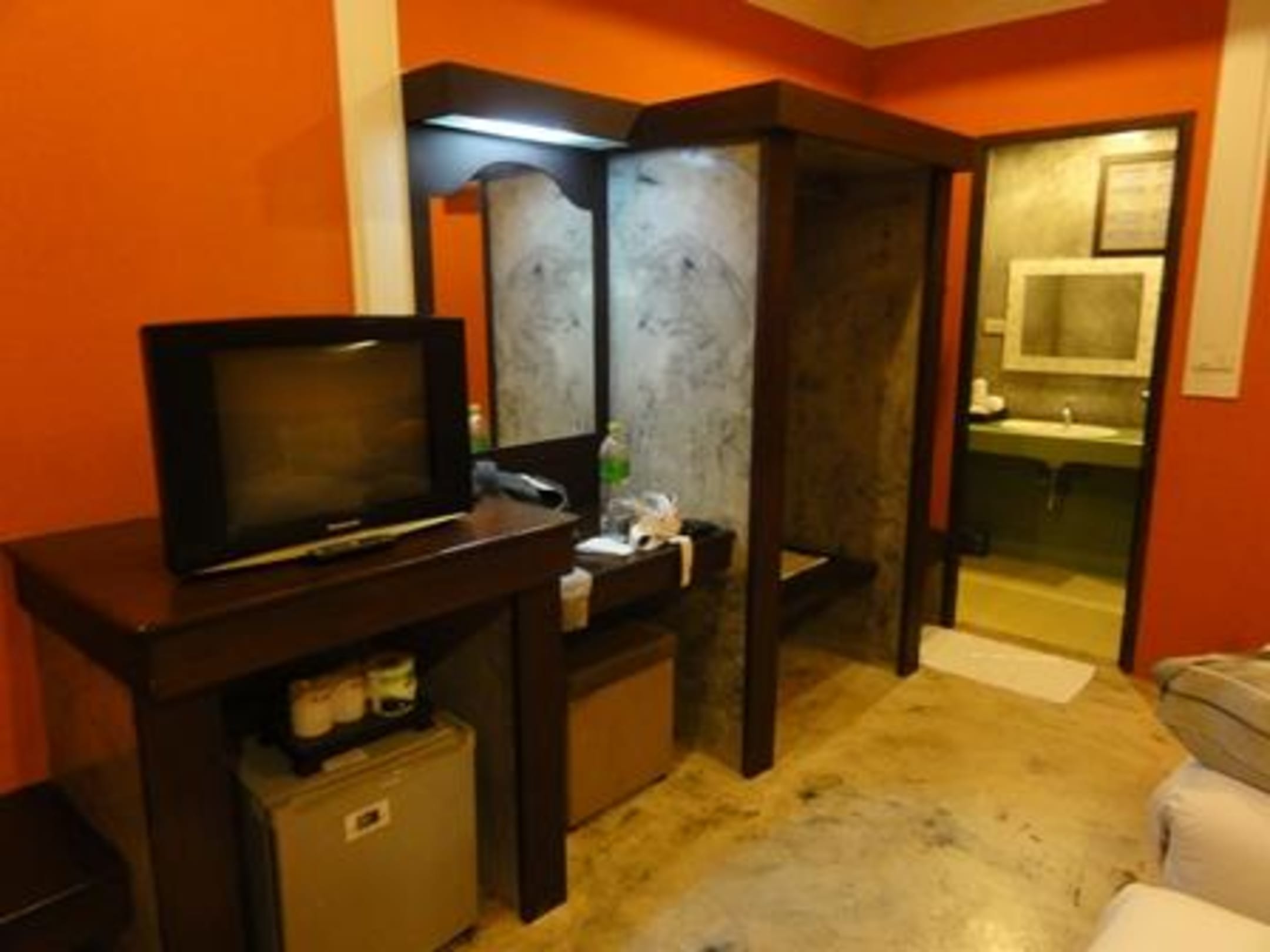 Möblierung mit Blick ins Badezimmer