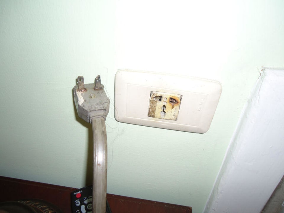 Verschmorte Elektrik von der KlimaanlageLebensgefährlich für alle Gäste, die Steckdose ist nur 30 cm vom Bett entfernt.