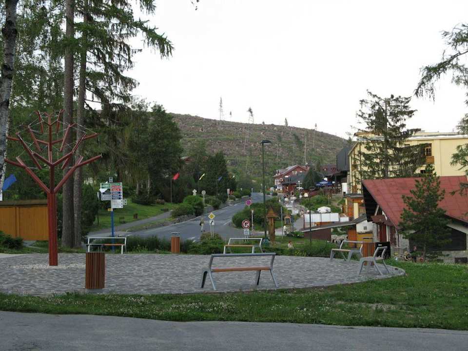 Hauptstraße in Stary SmokovecLinks der Hauptstraße liegt hinter einem kleinen Park das Grandhotel. Auf der rechten Seite der Hauptstraße befinden sich Geschäfte, wie z.B. Sportwaren, Lebensmittel, eine Bank. Ca. 50 m hinter den Geschäften liegt auf der rechten Seite der Bahnhof.