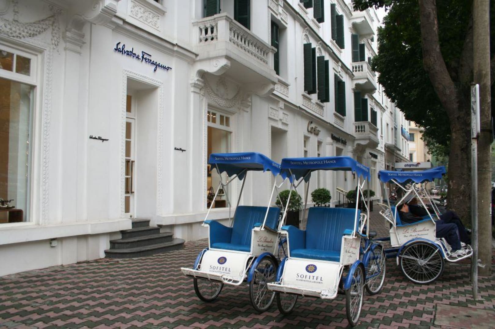 Fahrrad-Rikschas vor dem Sofitel Metropole.