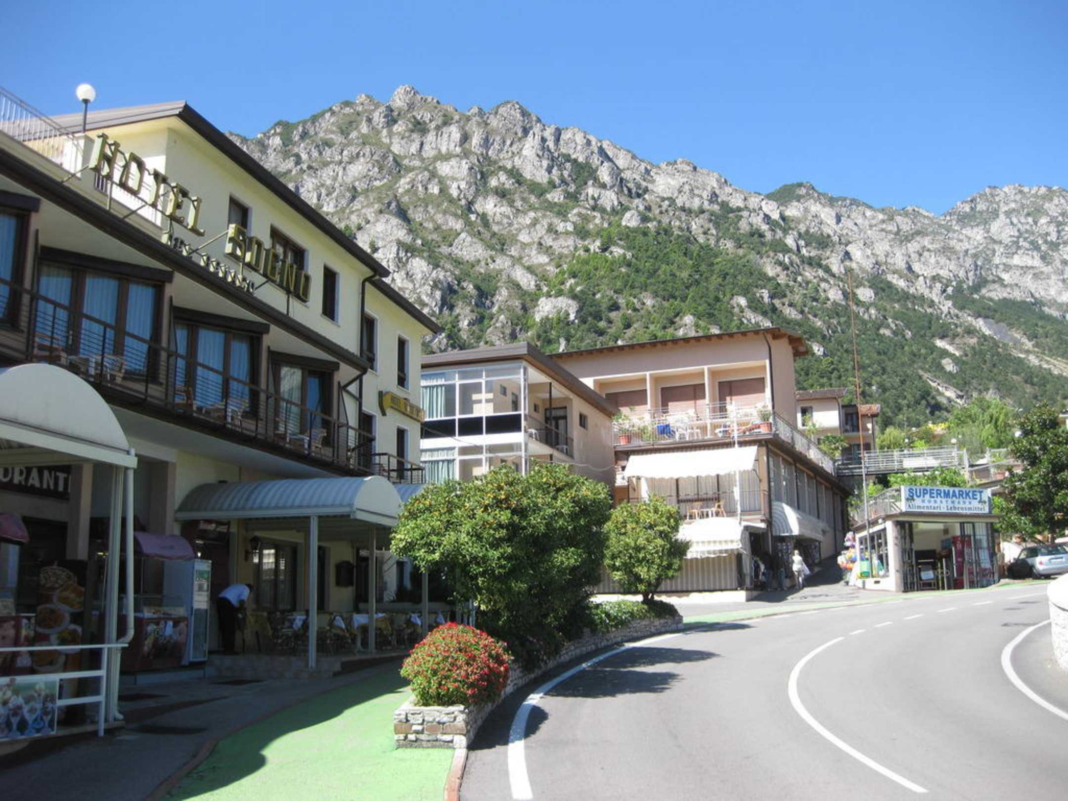 Blick von der Strasse auf die vordere SeiteBlick von der Strasse auf den Hotelgast Aussenterrassen Bereich mit Eingang im Hintergrund