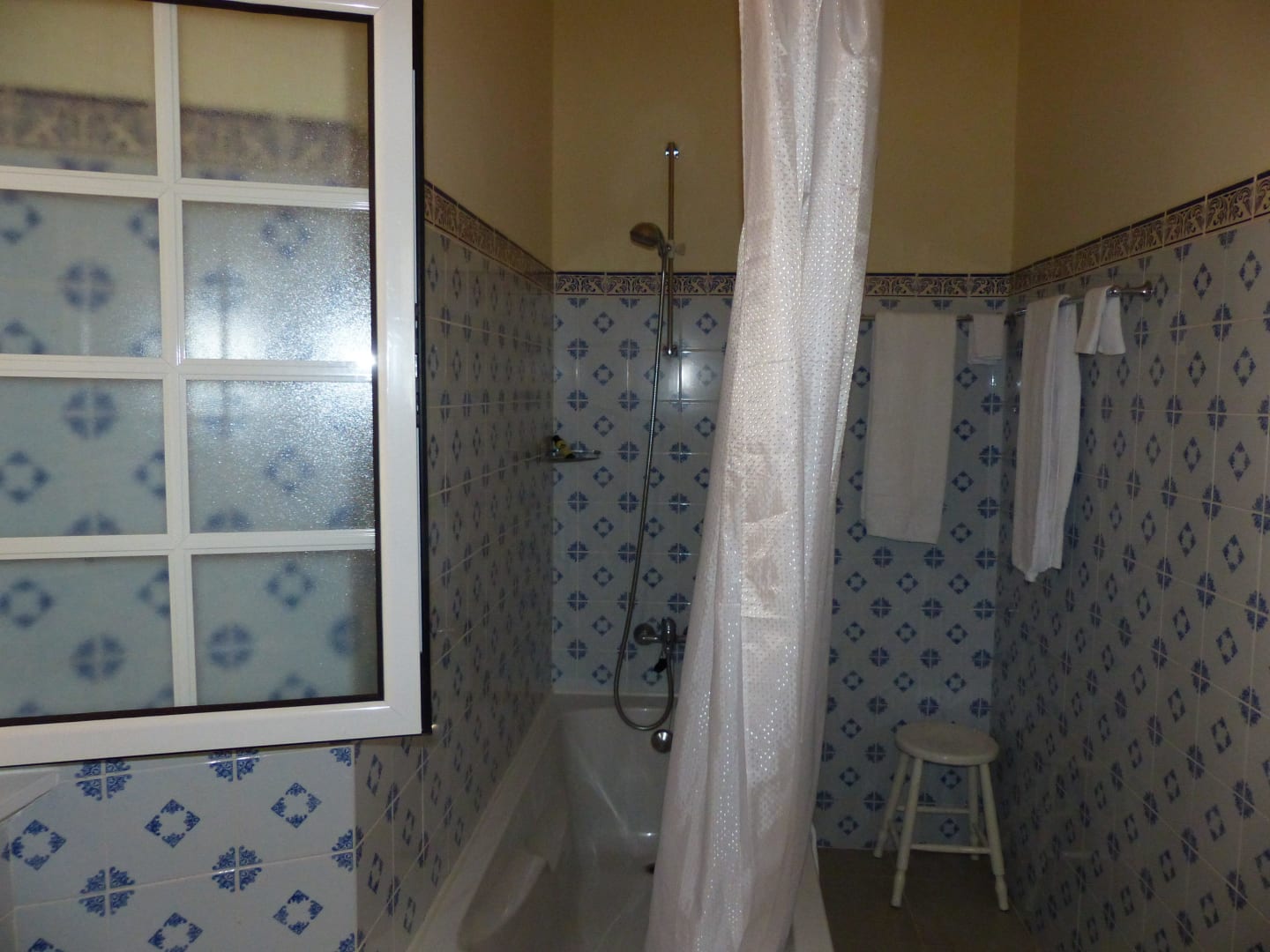 BadBadewanne mit Dusche; leider nicht mehr ganz zeitgemäß und für Gäste mit eingeschränkter Mobilität wenig geeignet.