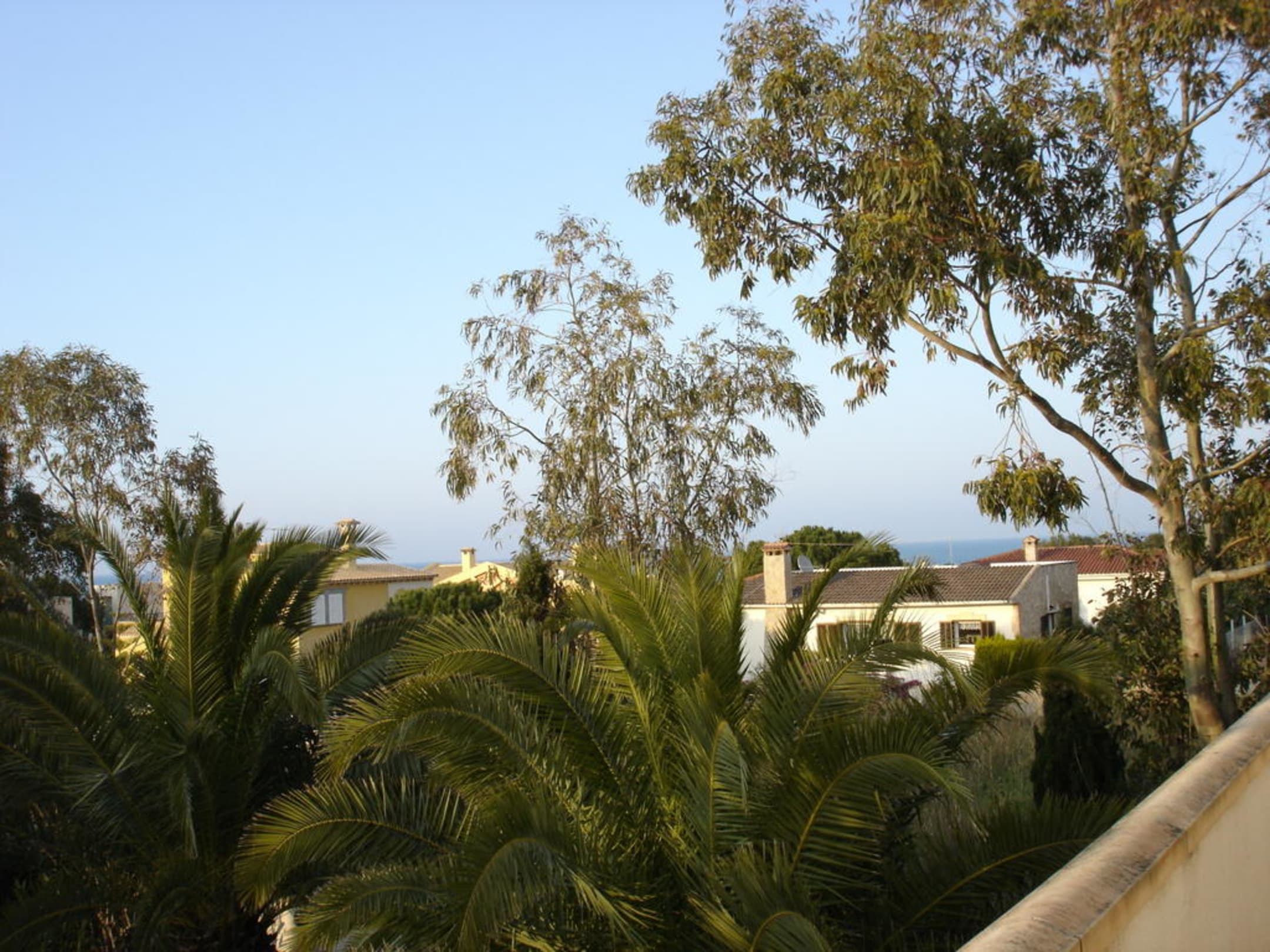 Vom Balkon hat man einen schönen Blick über den Garten auf das Meer und zur Seite hin auf die benachbarten Häuser.