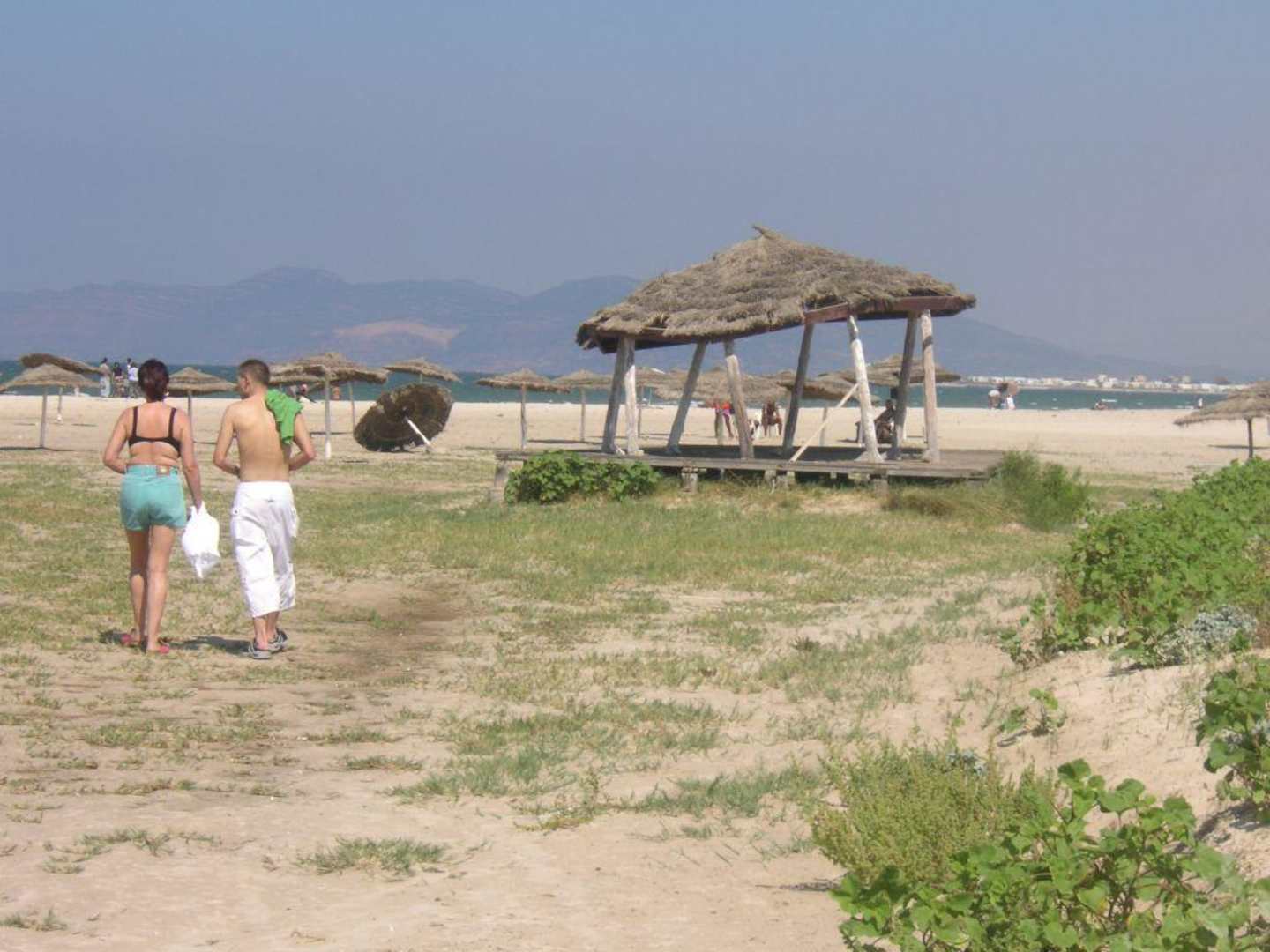 Strandliegeplatz vom Solymar mit baufälligen Sonnenschirmen und ??Pavillion??
