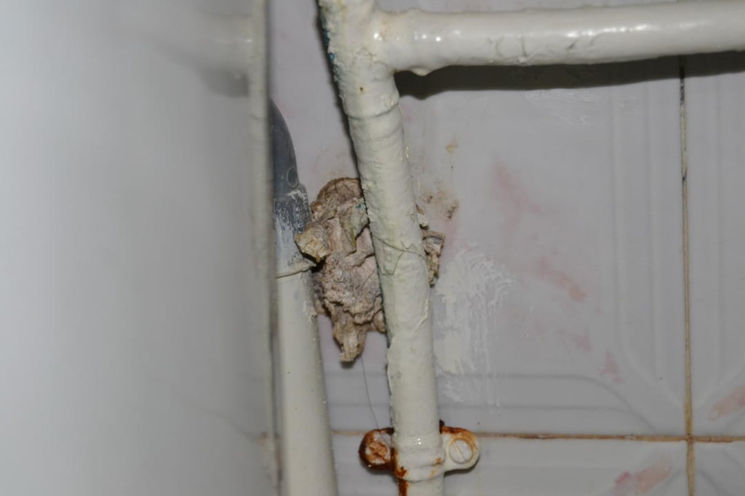 Undefenierbarer Müll klemmt hinter den Wasserrohren unterm Waschbecken