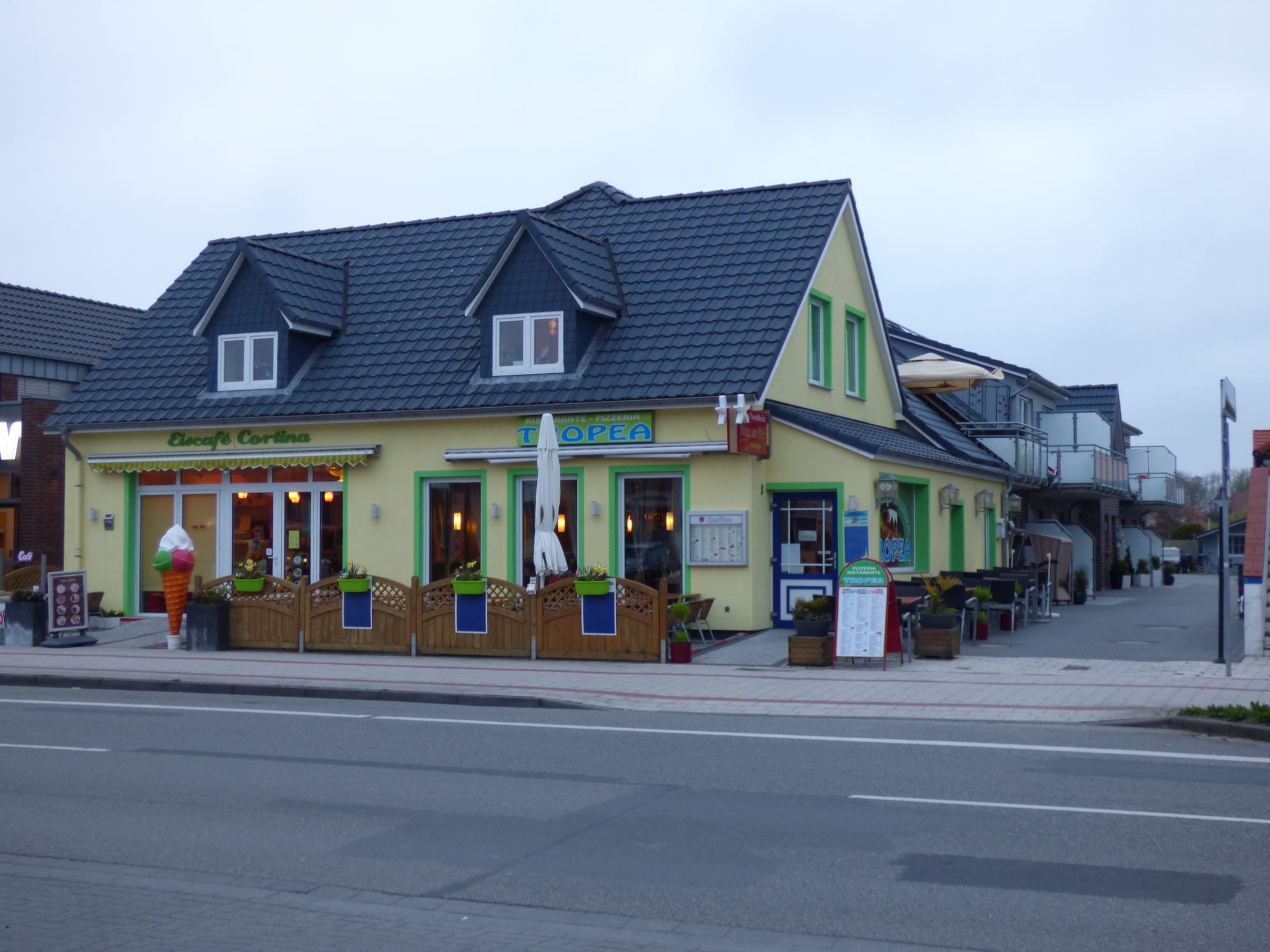 AußenansichtRechts ist die Einfahrt zum Parkplatz. Vorne links ist die Eisdiele in der das Frühstück stattfindet und rechts eine Pizzeria.