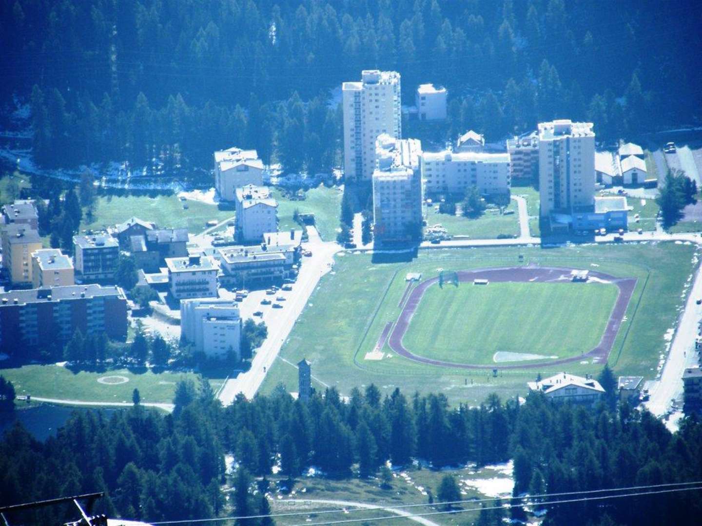 Fernsicht zum HotelBlick aus der Corviglia Zahnradbahn zum Hotel (links vom Sportgelände)