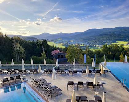 Blick vom Wellnessbereich aus auf die beheizten Außenpools mit Großem Arber im Hintergrund
