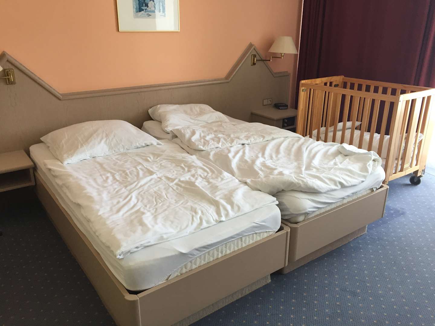 ZimmerDie Betten lassen sich zusammenschieben. Das Babybett könnte für kleine Mütter zum Problem werden, da die Matratze sehr tief angebracht ist.