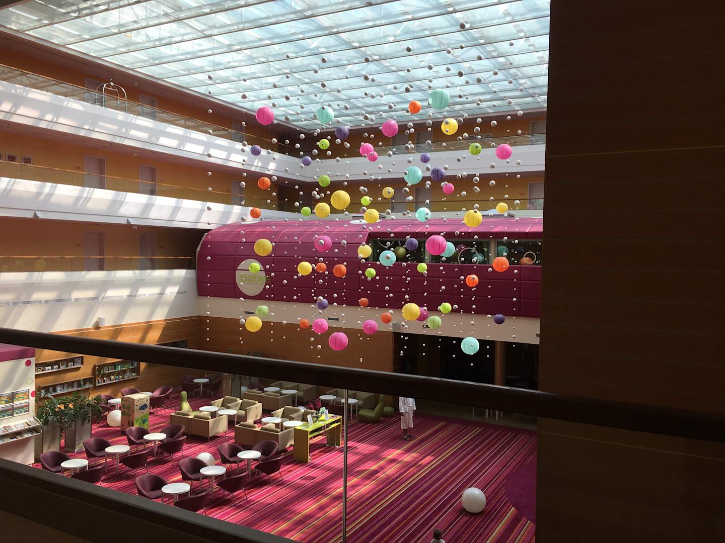 Blick vom 1. Stock in die Lobby ... viele bunte Ballons hängen von der Decke