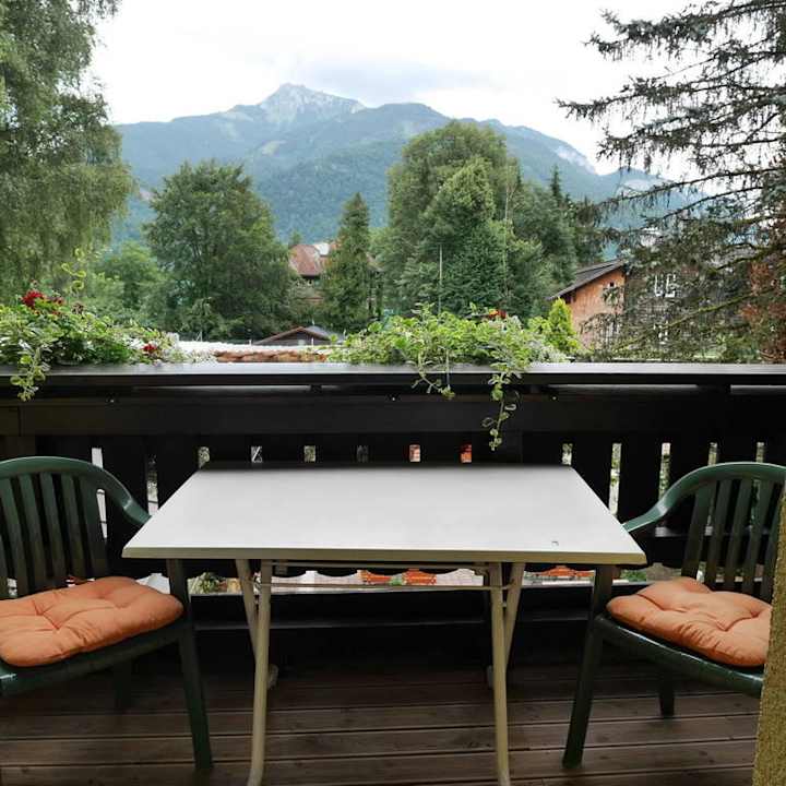 Blick vom Balkon zu den Bergen