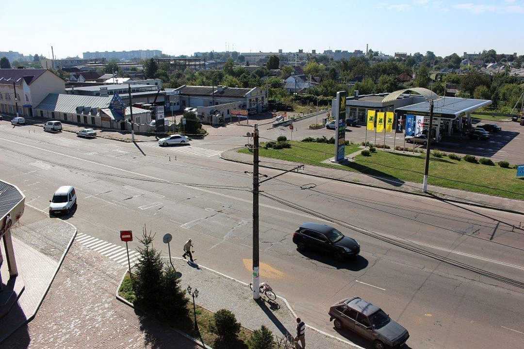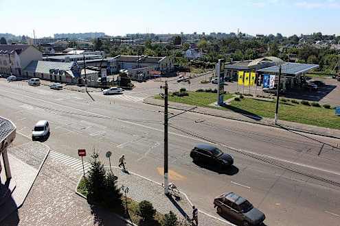 Blick aus dem Zimmer auf Straße und Tankstelle