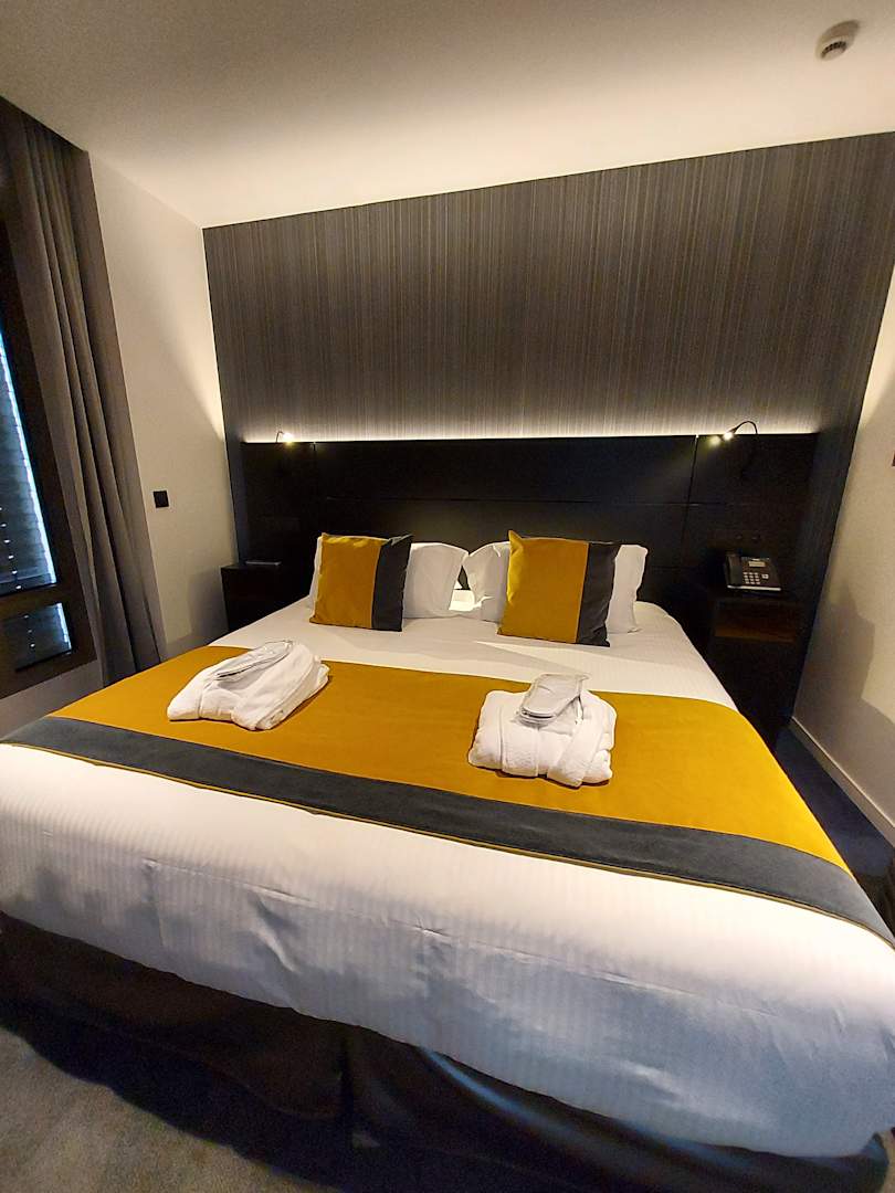 ZimmerBequemes Bett mit einer Auswahl an Kissen. Darüber hinaus gab es, wie man sehen kann, für jeden einen Bademantel und Slipper.