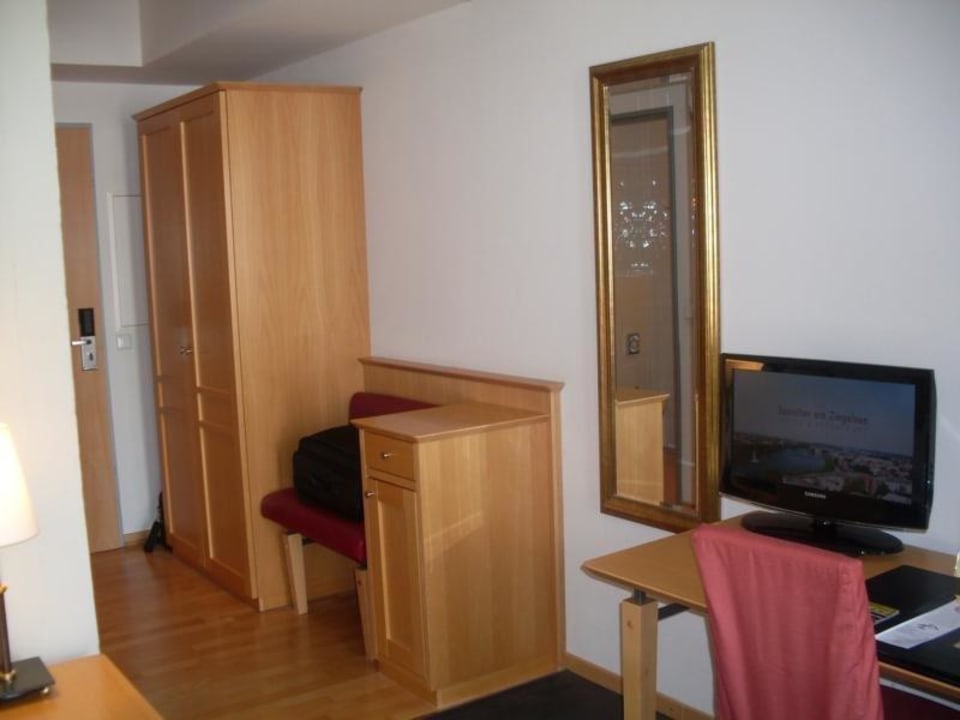 Schrank, Schreibtisch, Kommode, TV und Spiegel.