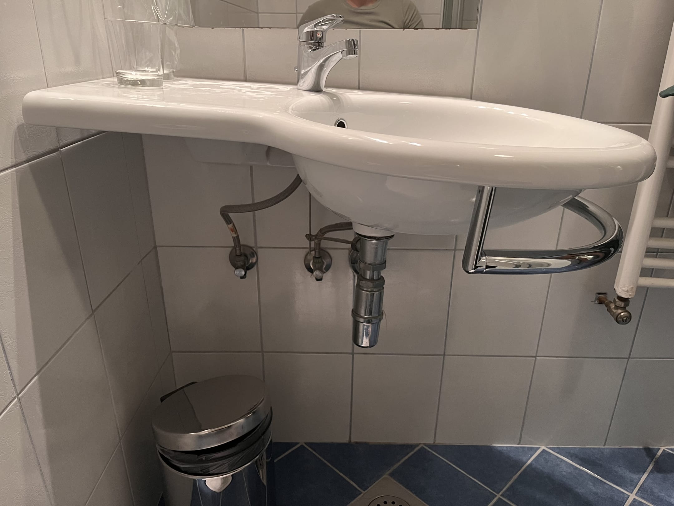 Komplett schiefes Waschbecken (siehe im Vergleich zu dem geraden Spiegel).