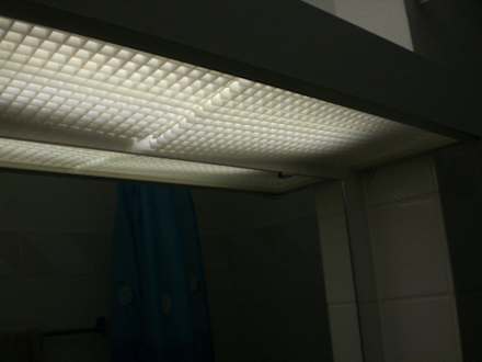 Defekte BadbeleuchtungSchief hängende Spiegelbeleuchtung im Badezimmer