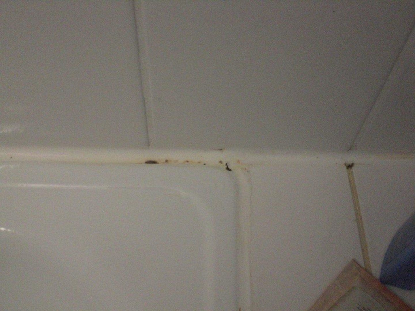 Schimmel im Eckbereich der DuschwanneAuch in der anderen Ecke ist deutlich Schimmel u. a. in den Eckfugen zu erkennen
