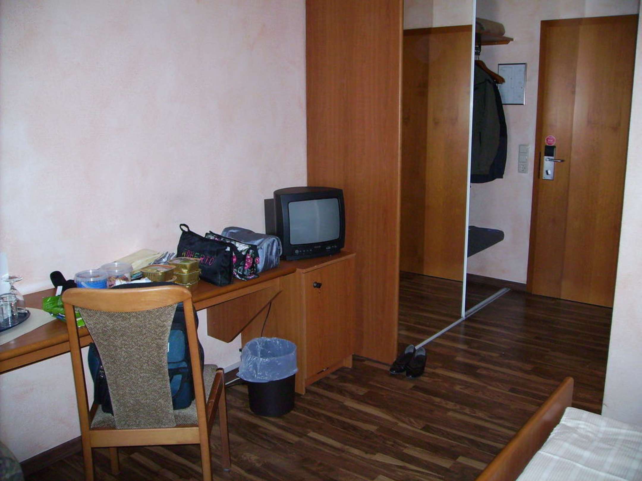 Der Schreibtisch und der Schrank vom Fenster aus
