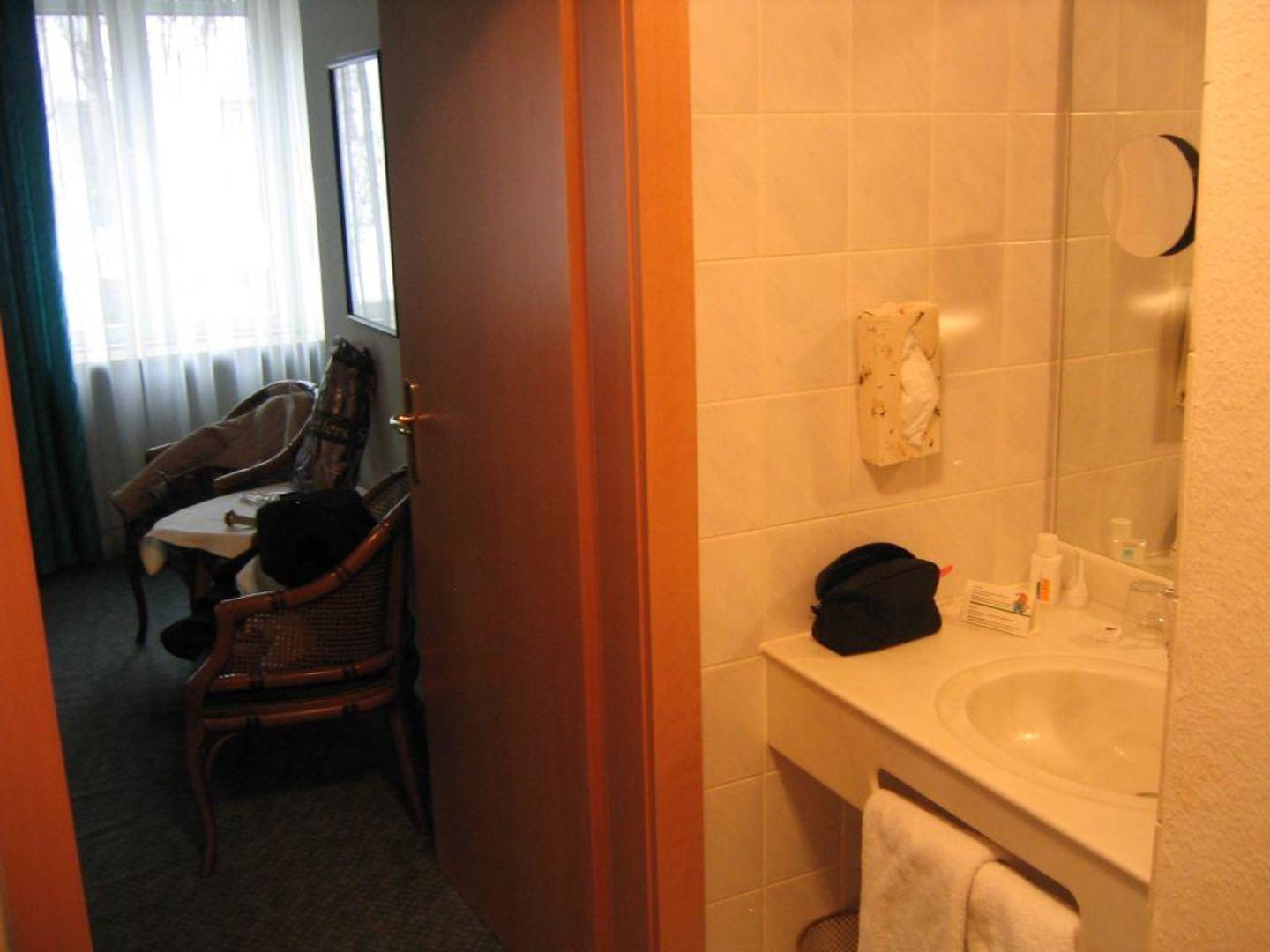 Hotel Stachus - Vorraum mit BadBlick durch die Eingangstür. Skurril: Das Waschbecken war getrennt von Dusche/WC im Vorraum des Zimmers.
