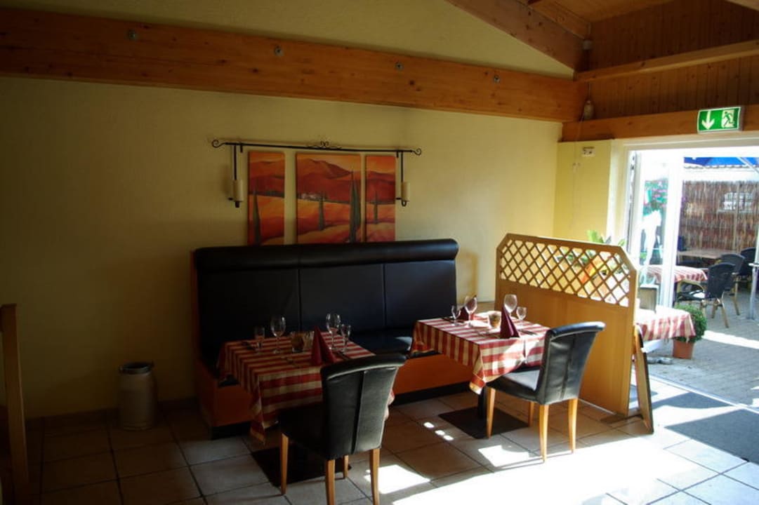 San MicheleDas Bild zeigt einen Tisch im Restaurant mit Blick auf den Innenhof, der auch Stühle, Tische und riesige Schirme hat
