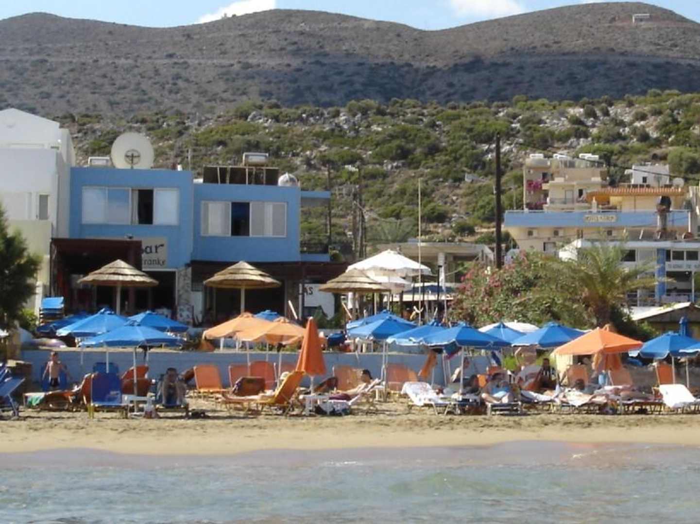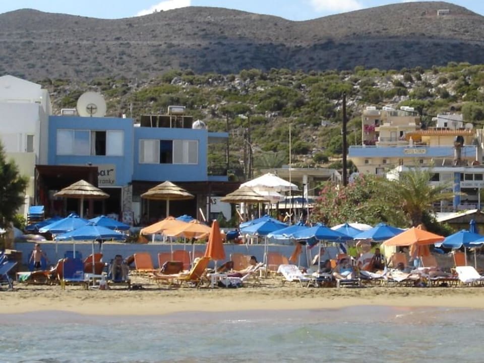The blue buliding on the left side of the picture is the pool bar with the pool, and on the right side in the background is the main buliding of the hotel