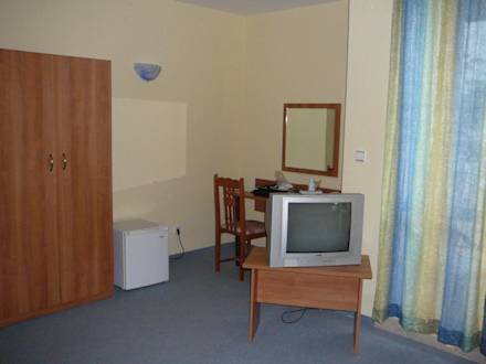Wohnbereich des ApartmentWohnbereich des Apartment mit Kühlschrank, Schreibtisch, Kleiderschrank und TV-Gerät