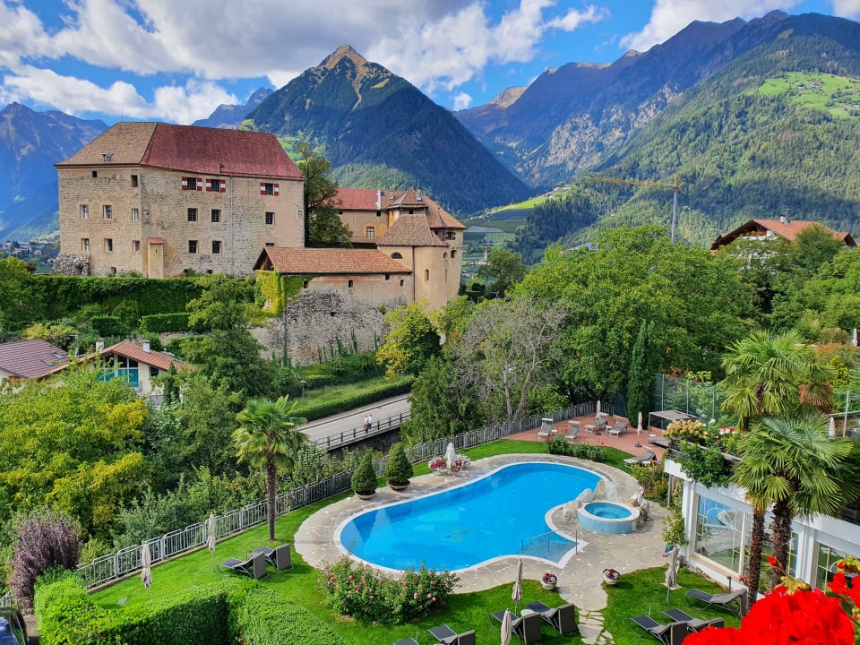 Ausblick vom Balkon auf Schloss und Pool.