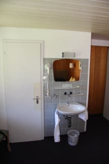 Waschbecken im ZimmerWaschbecken im Zimmer, dahinter befinden sich WC/Dusche in einem abgemauerten Raum.
