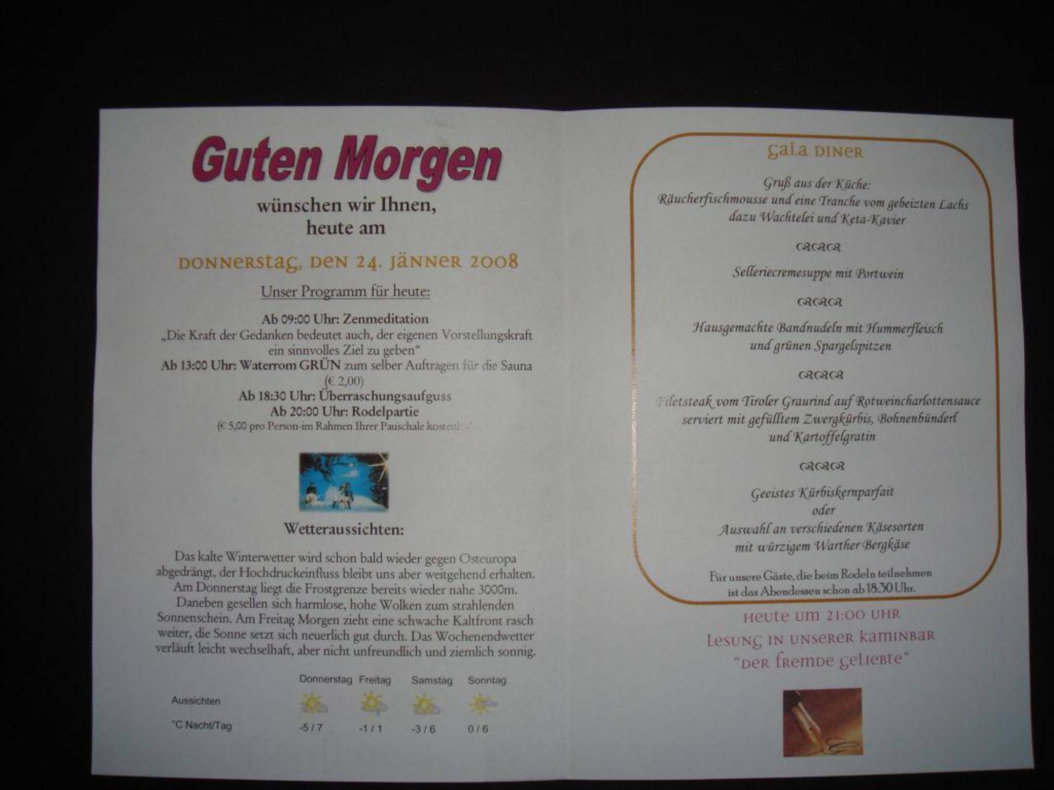 GaladinerJeden Tag gabe es das Tagesprogramm mit dem Menue. Hier ohne Auswahl, weil es das Galadiner war.