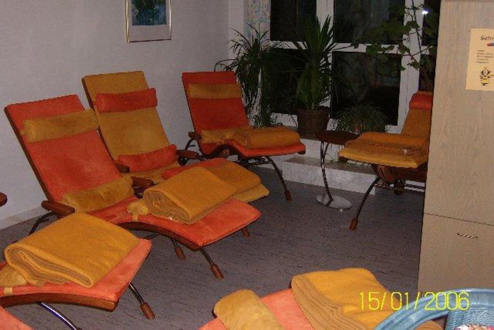 Relaxliegen im FitnessraumNeben den Fitnessgeräten befinden sich Relaxliegen und auf einem Tisch liegen verschiedene Zeitschriften bereit
