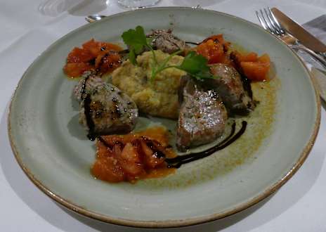 Gegrillte Schweinefiletstreifen mit Steinpilzpolenta und geschmolzenen Tomaten