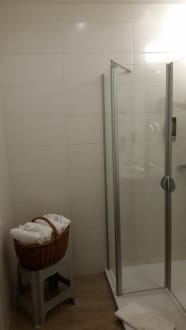 Bad mit Dusche und Waschbecken.