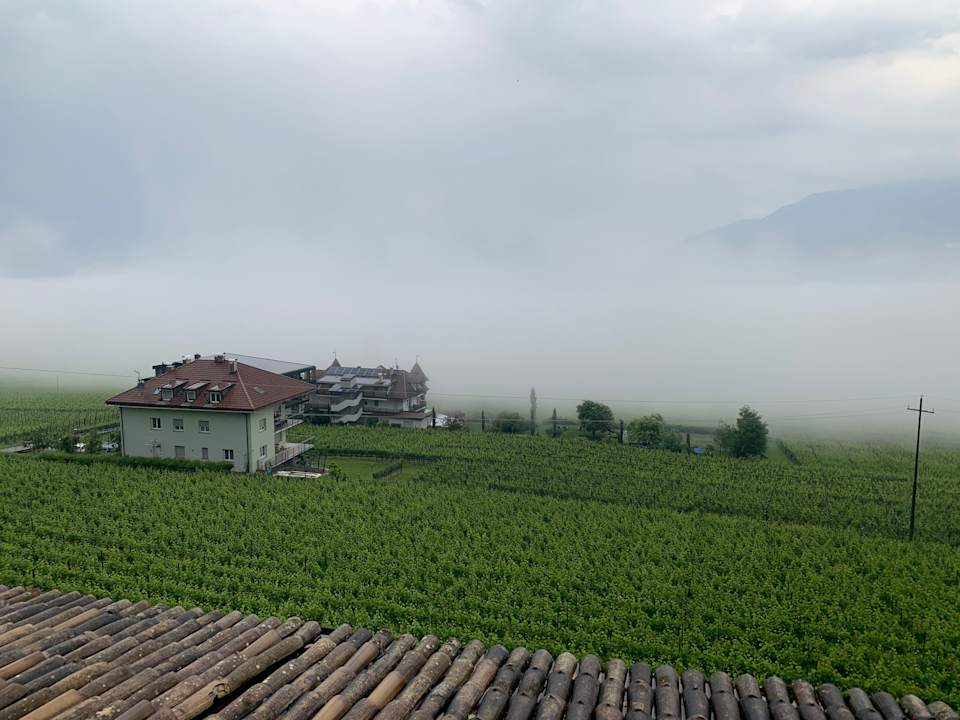 Blick vom Balkon am frühen Morgen über Eppan