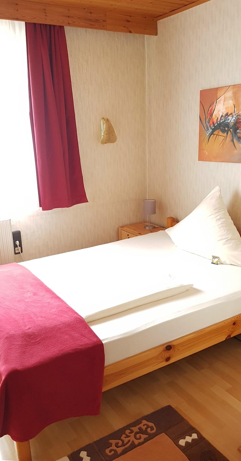 Zimmer mit Dusche, mit 140 cm breitem Bett.