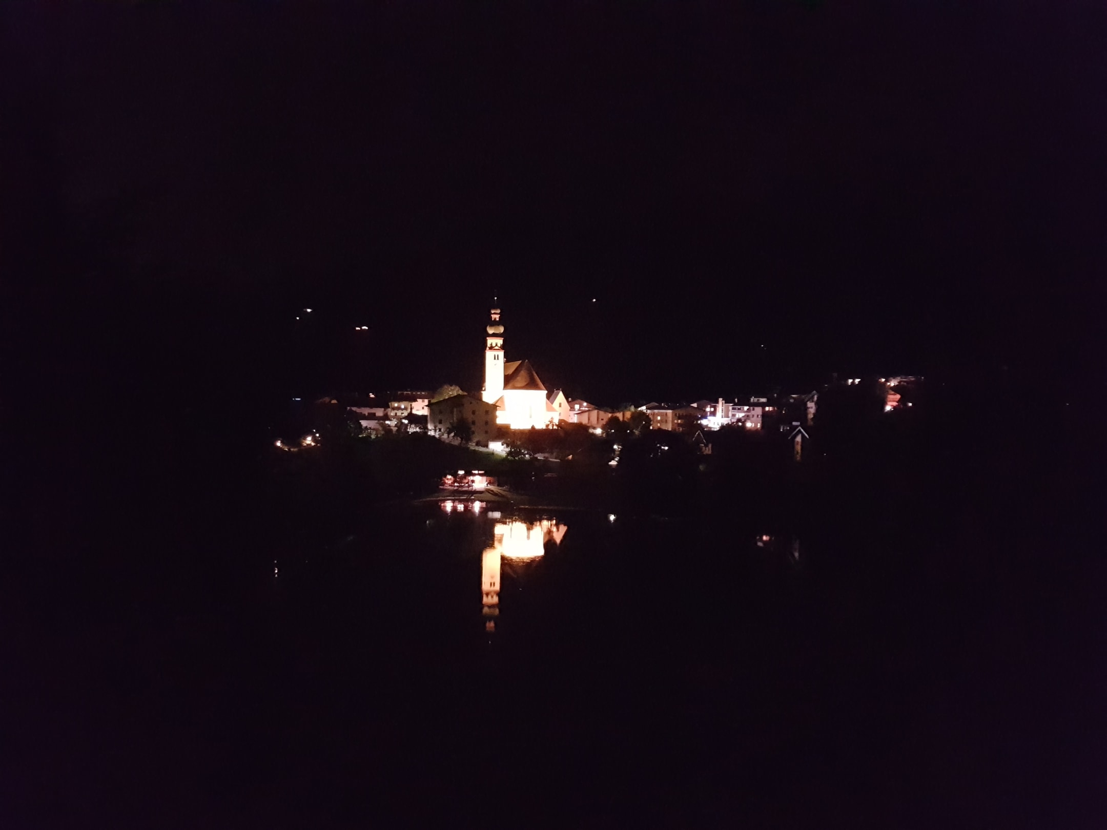 Kirche in Reith mit Spiegelbild im Badesee bei Nacht
