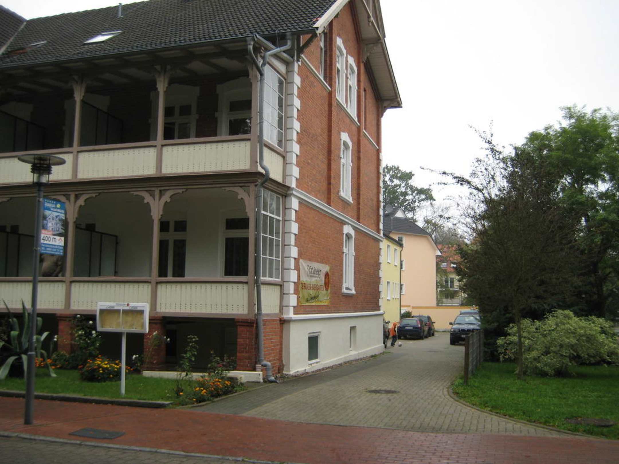Rechte Seite des Hotels mit Zufahrt zum Parkplatz
