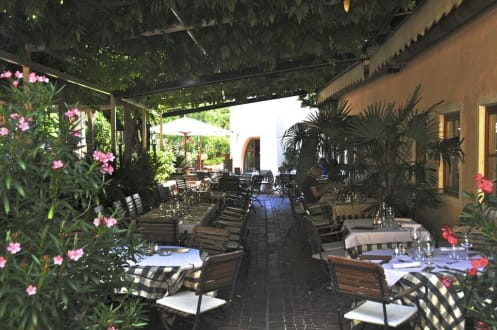 Gartenterrasse im SommerBlick auf die Terrasse am Stroblhof am Nachmittag im Juli. Es ist bereits für den Abend eingedeckt...