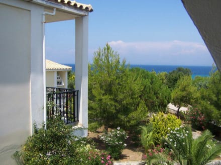 Vom Balkon hat man einen traumhaften Blick über den schönen Garten bis zum Meer.