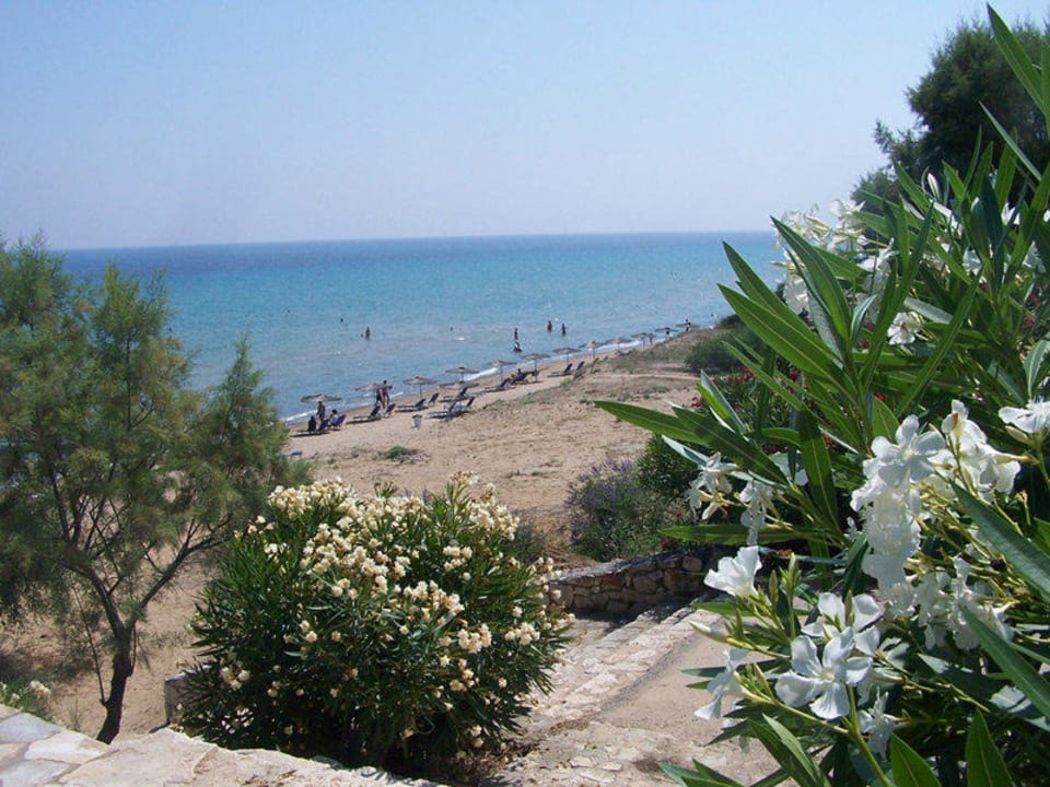 Es sind etwa 10 Stufen vom Pool hinunter zum schönen Sandstrand. Das Wasser ist glasklar und flach abfallend. Die ersten 4m sind Steine im Wasser. Die Liegen sind kostenpflichtig.