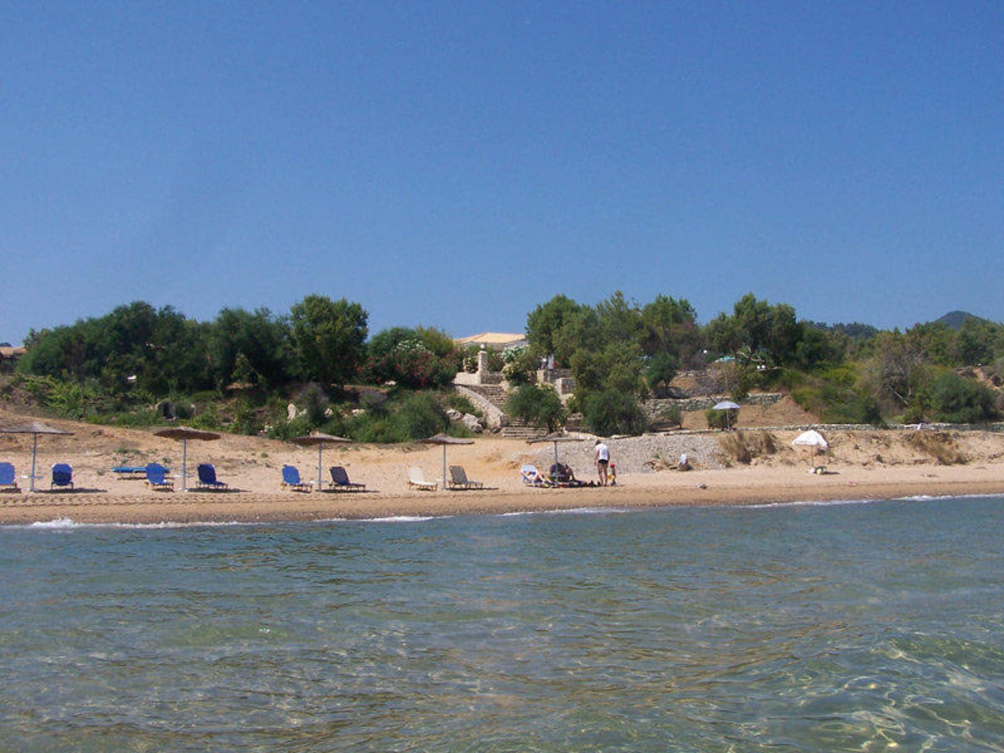 Der kleine ruhige Strand und im Hintergrund ist das Hotel.
