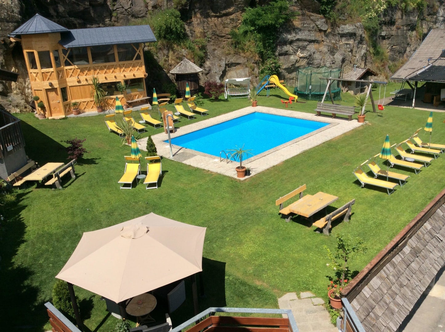 Blick von Balkon auf den Pool und Saunahaus
