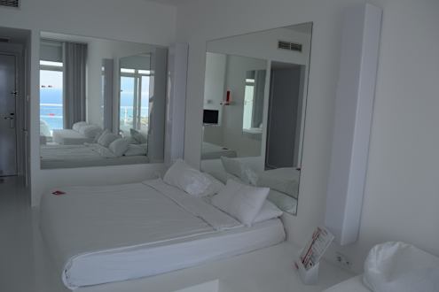 Doppelbett. Zu allen Seiten hin gibt es Spiegel
