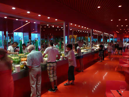 Man wundert sich beim Abendessen im roten Hauptrestaurant über das 50 Meter-Büffet voller leckerer Salate, Suppen, Brote, Hauptspeisen und Beilagen - und erst recht über weitere 30 Meter Desserts im nächsten Raum. Wahnsinn!