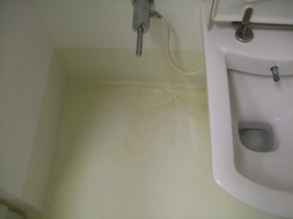 Bereich hinter der ToiletteDer Fußboden hinter der Toilette. Wie zu erkennen ist gibt es keine Toilettenbürste. Dafür aber Schmutz!