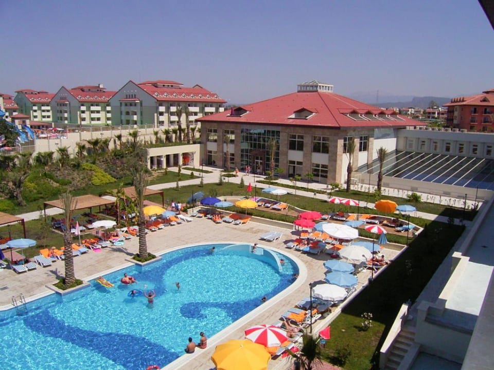 Hier ein Blick von Block 2 vom Balkon (Zimmer 2312) Rechts das Schwimmbad, in der Mitte das Haupthaus, dann Links ein kleiner Blick auf den Animationspool mit den Wasserrutschen, und die Hotelblöcke 5,6,7 & 8