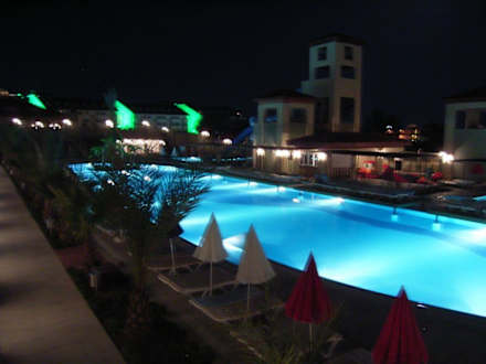 Hier ein Blick auf den Animationspool bei Nacht, vom Dach der Einkaufspassage aus