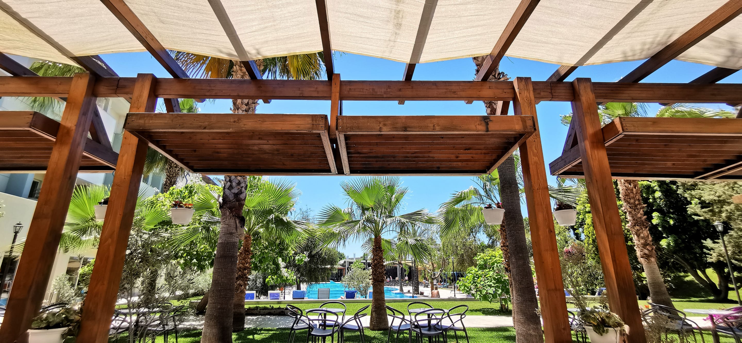 Blick vom sehr schönen Lounge Bereich auf den großen Pool