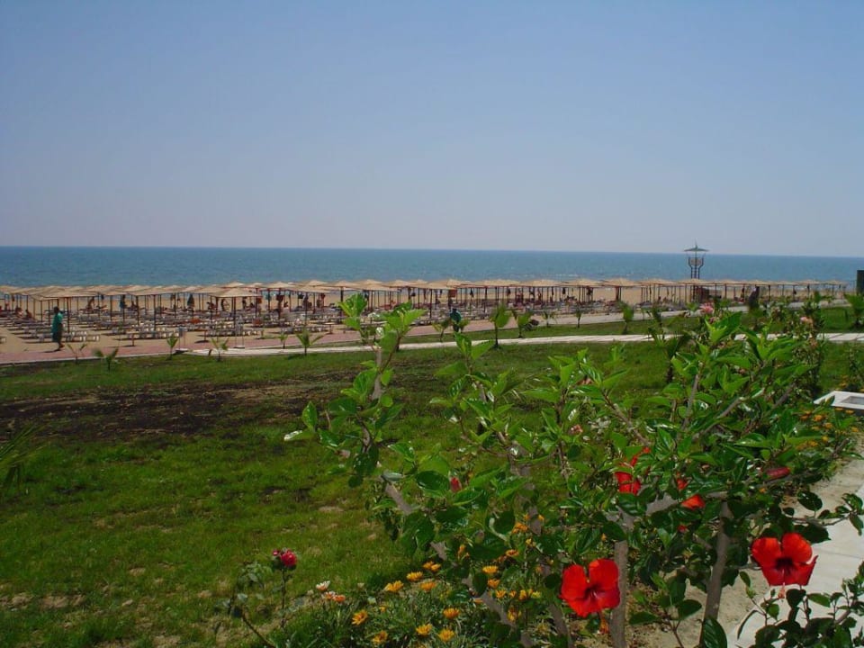 Blick von der Snackbar auf den Hoteleigenen Strand mit Liegen
