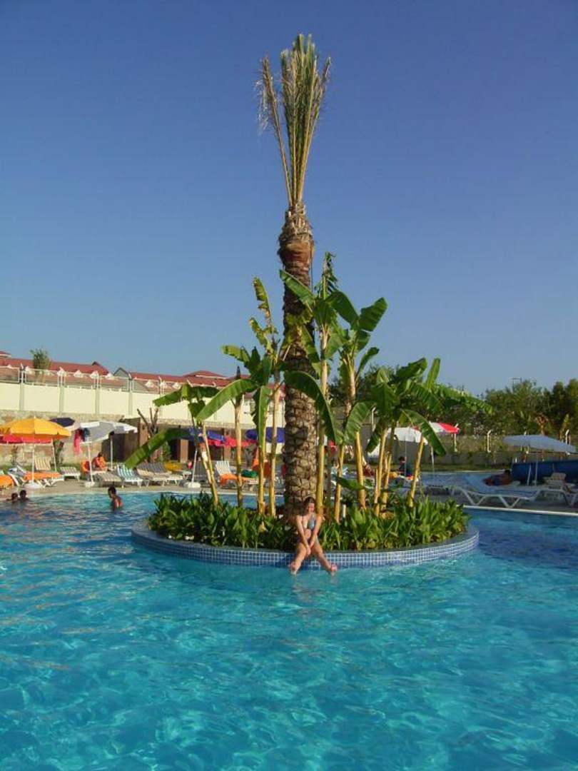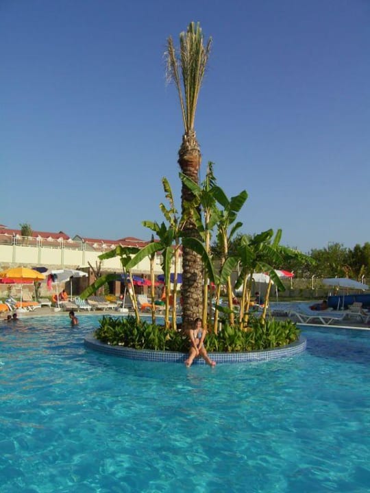 Der vordere Teil vom Animationspool mit der schönen Insel mit der Palme in der Mitte